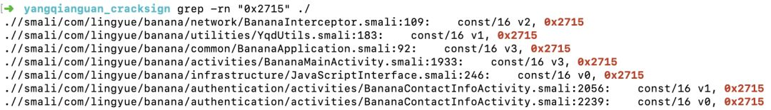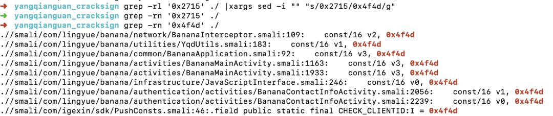 这里直接用命令搜索:0x2715=10005,看到其实还是蛮多的,如果笨一点的方法就是依次把这些文件打开替换成最新的版本即可:0x4f4d=20301,不过笨办法的操作这里就不说了,这里我们可以利用Mac中的命令全局替换,说到这里真的不得不说Mac中的命令行工具比Windows强大不少,感觉还是Mac更适合开发哈哈哈,不过可惜的是现在很多好用的破解小工具都是在Windows下编写的,Mac上没法使用,这一点挺可惜的