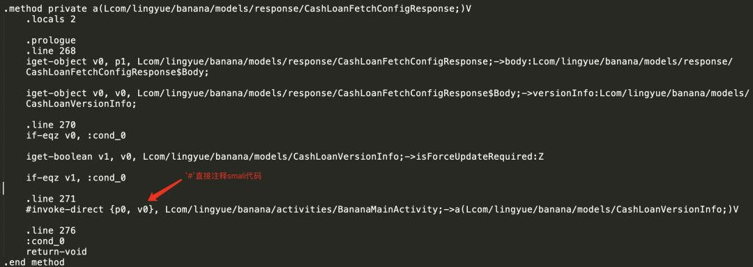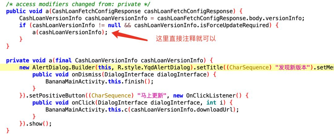 看到这里有个更新对话框展示逻辑,有个强更新判断,这个简单直接找到对应的smali代码注释即可:
