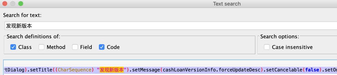 • 第三、如果有的应用有强更新操作,但是我们又不想更新,可以直接修改xml中的versionCode值来进行操作,但是如果发现失败了,可以直接全局搜索反编译之后的代码中是否有指定的版本号,如果有直接用命令全局替换即可