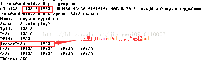 在第一种方式中,我们简单的介绍了如果应用被调试了,那么他的TracerPid值就是调试进程的pid值,而在使用IDA进行调试的时候,需要在设备端启动android_server进行通信,那么被调试的进程就会被附加,这就是android_server进程的pid值了: