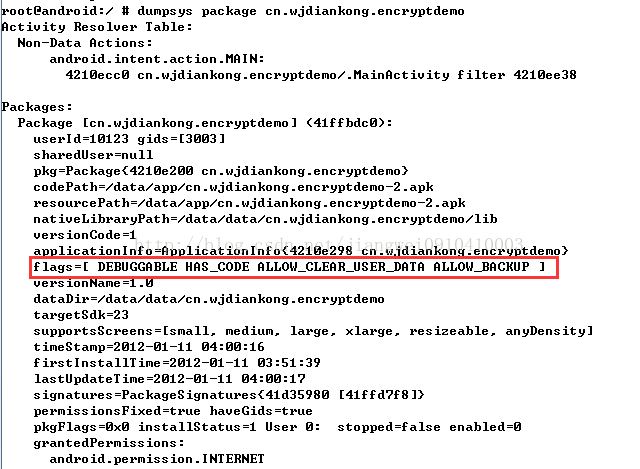 添加这个属性之后,我们可以用 dumpsys package [packagename] 命令查看debug状态: